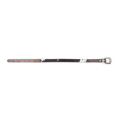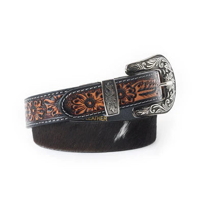 You'll channel your inner cowgirl in amazing style with this stunning hairon leather belt! Intricate floral tooling creates a vintage Western aesthetic, while the ornate silver buckle adds timeless glamour. Double-stitched edges ensure durability while highlighting the bold color.