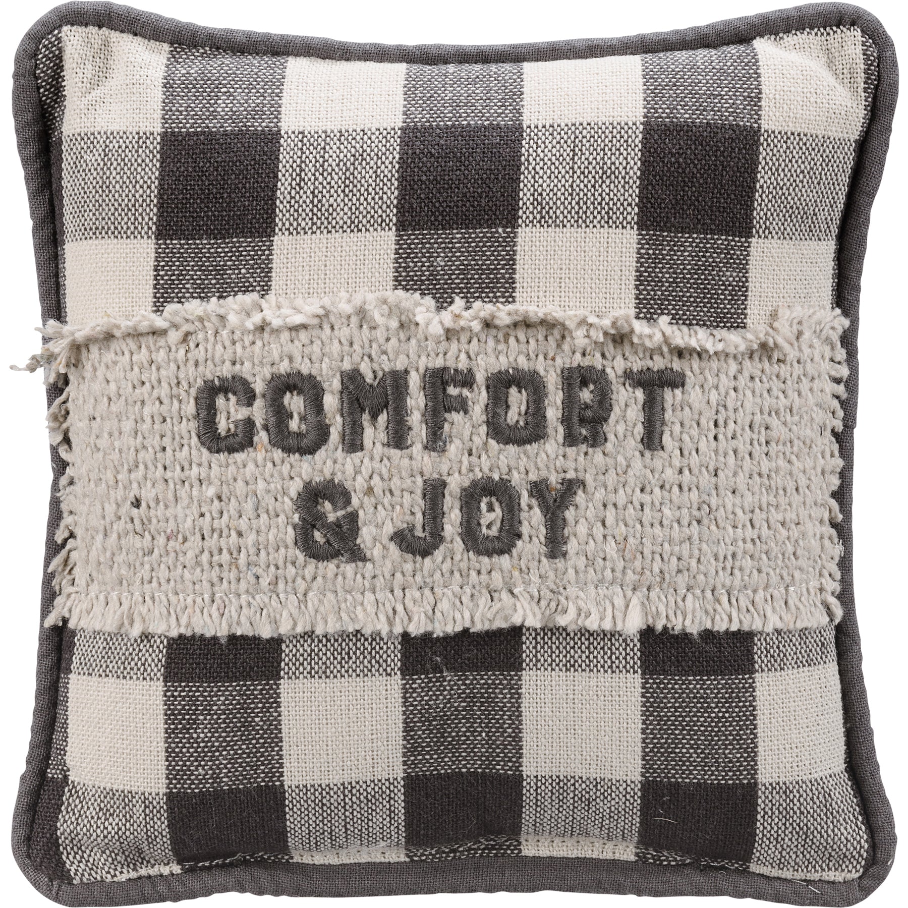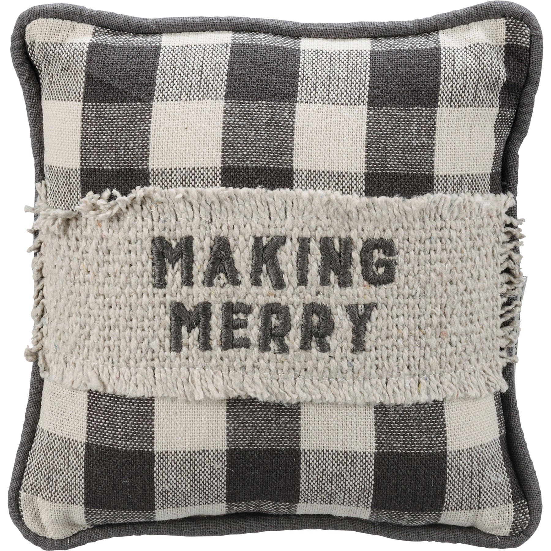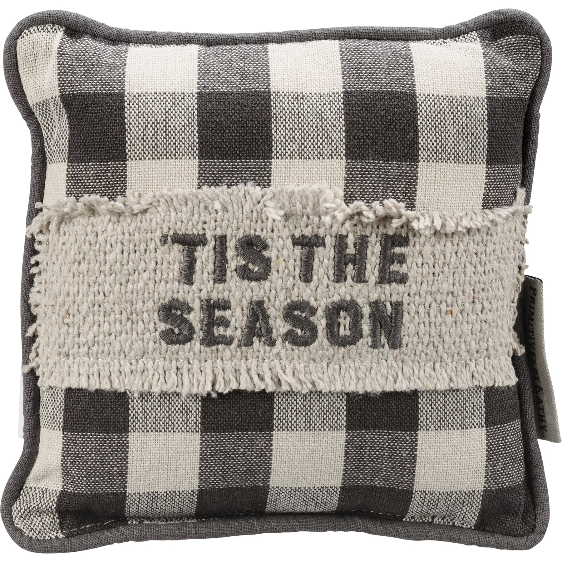 A double-sided cotton mini pillow featuring an embroidered sentiment, chikan stitch and raw edge fabric, buffalo check pattern, and piped trim. These truly are a "mini" pillow.
