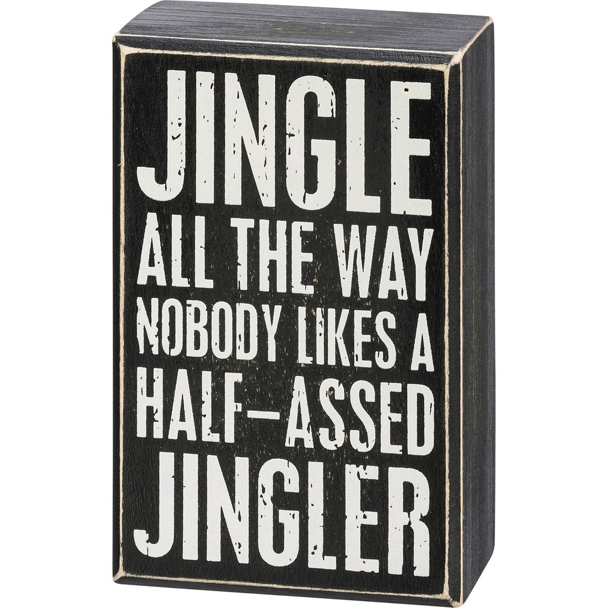 A perfectly giftable set including a box sign with "Jingle All The Way Nobody Likes A Half-Assed Jingler" sentiment and a pair of socks featuring coordinating designs. Socks are cotton, nylon, and spandex and are machine-washable. One size fits most. Box sign is easy to hang or can free-stand alone. Socks come neatly rolled inside box sign and secured with tied cotton tape ribbon.