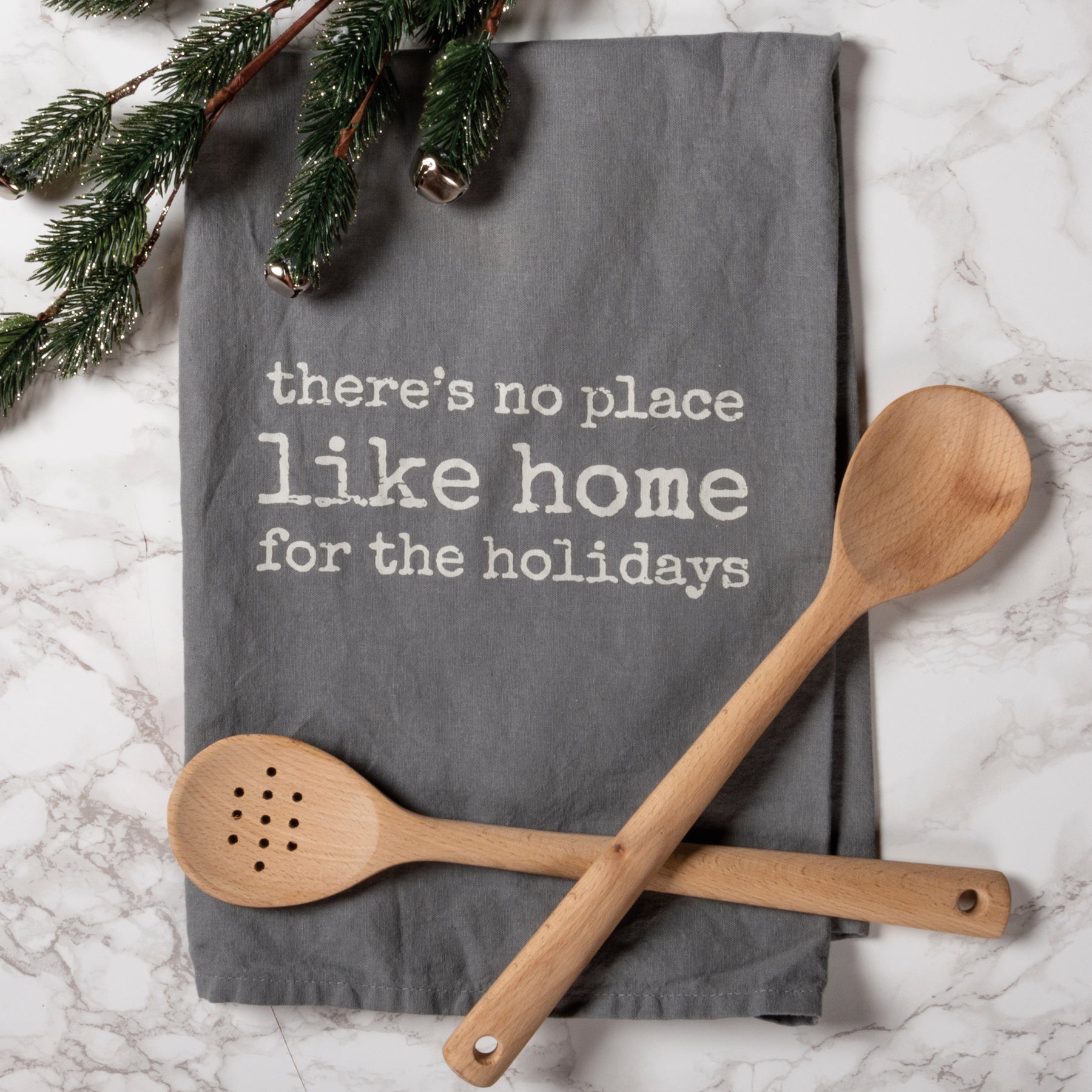 A cotton kitchen towel featuring a distressed "There's No Place Like Home For The Holidays" sentiment. Complements well with existing decor or coordinating designs. Machine-washable.