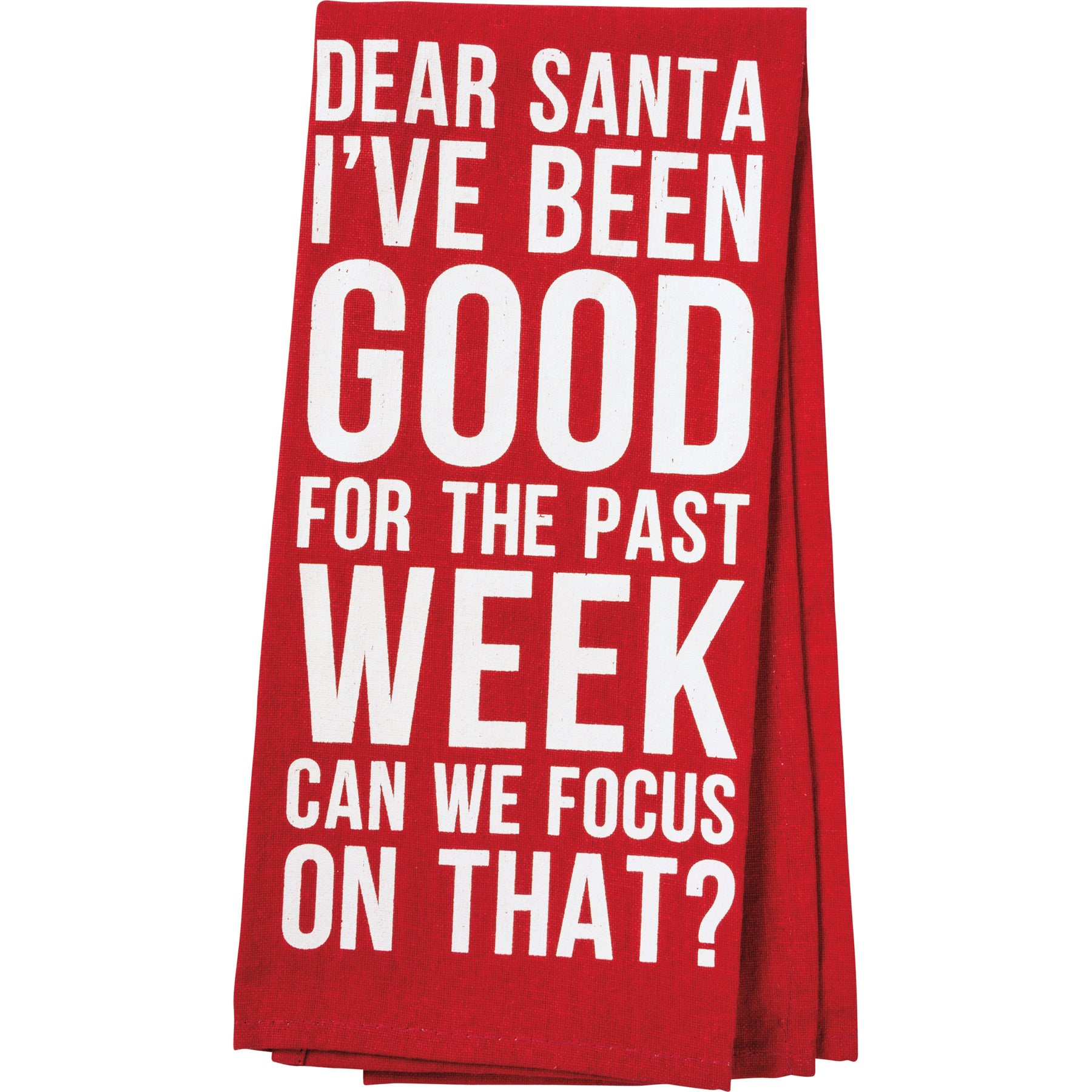 A colored box sign style cotton dish towel featuring a "Dear Santa I've Been Good For The Past Week Can We Focus On That?" sentiment. Includes attached Santa shaped cookie cutter and hangtag featuring full design. Towel features a cotton tape hangar and is machine-washable.
