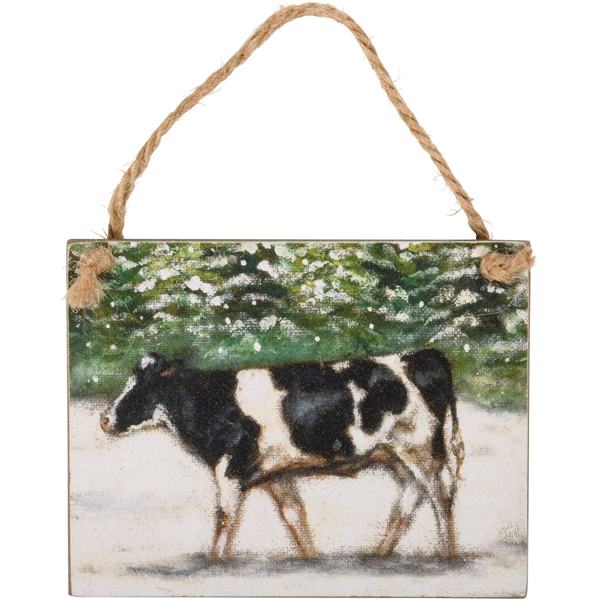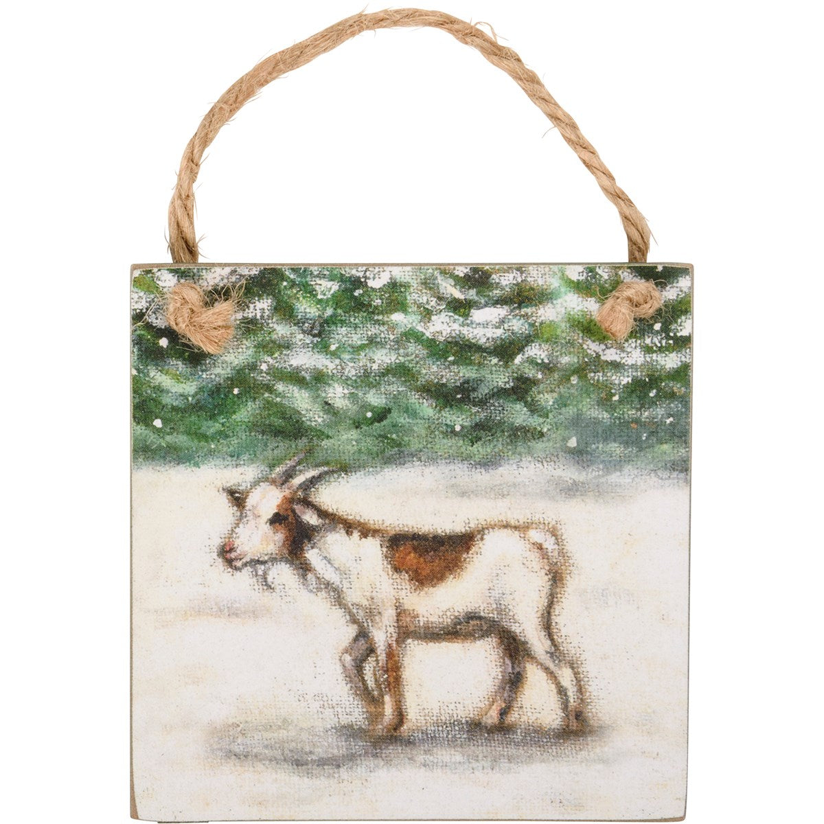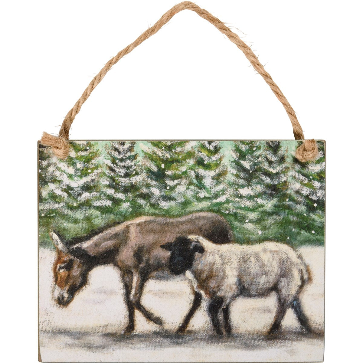 Three wooden ornaments featuring wintry farm animal designs replicated from original artwork painted onto burlap canvas, giving the art a unique depth and texture. Ornaments hang via attached jute ribbon.