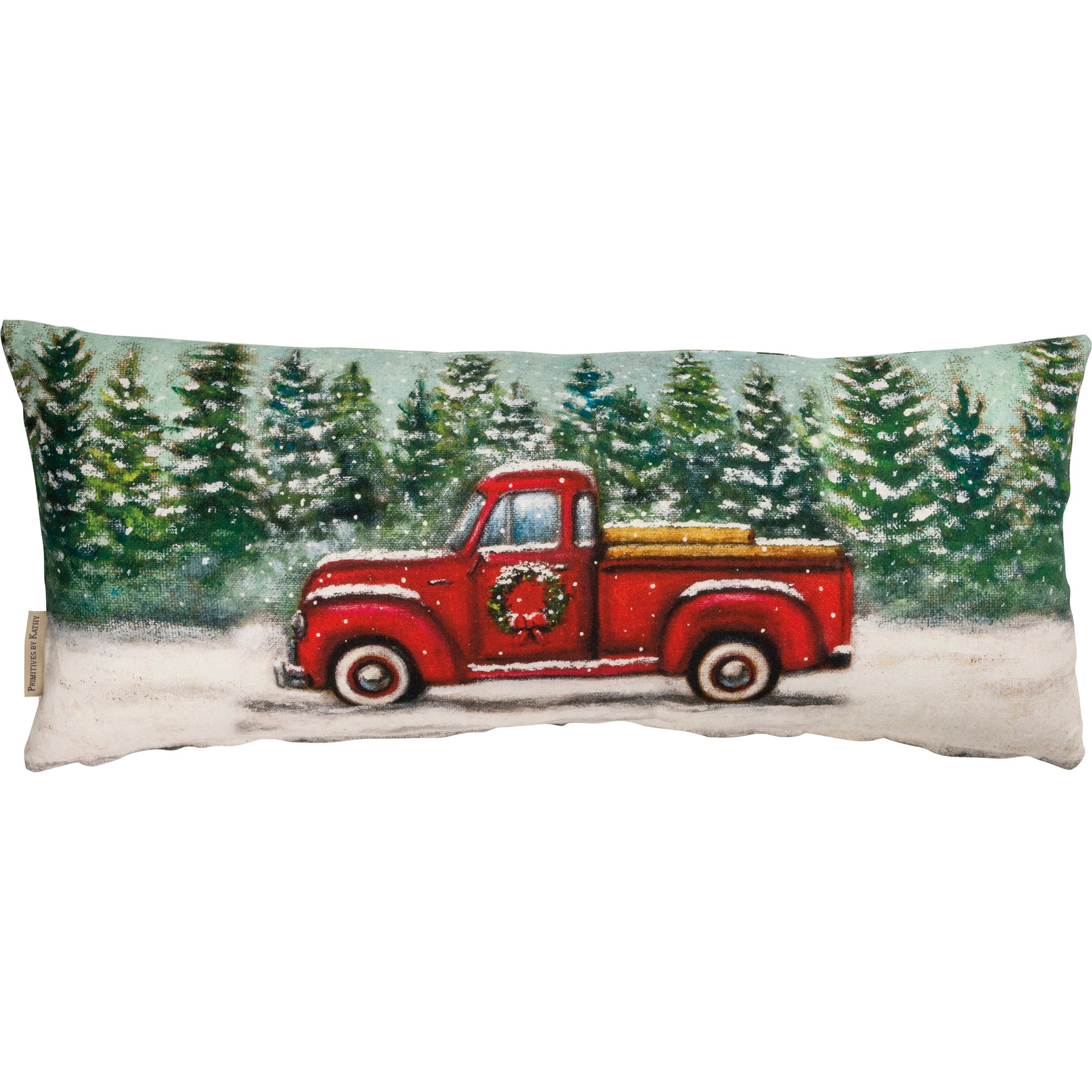 A double-sided pillow featuring wintry farm scenes including animals, a red truck, and evergreen trees on a cotton slub fabric. Designs are replicated from original artwork painted onto burlap canvas, giving the art a unique depth and texture. Polyester filling. Includes a zipper to easily remove and clean cover.