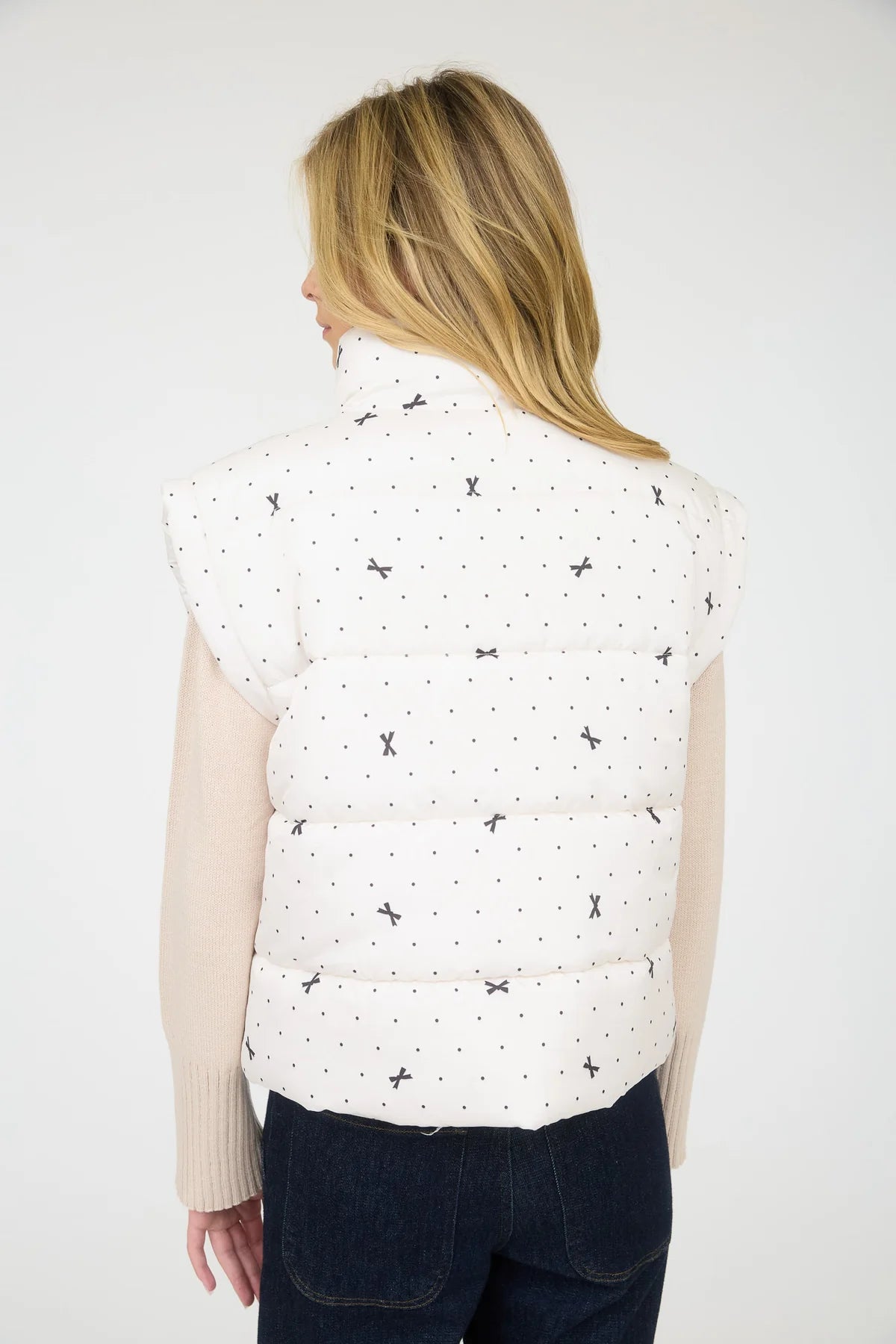 MOCK NECKLINE SLEEVELESS ZIP-UP POCKETS POLKA DOT & BOW PATTERN PUFFER VEST