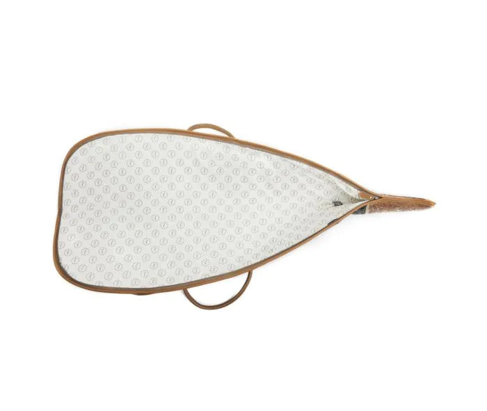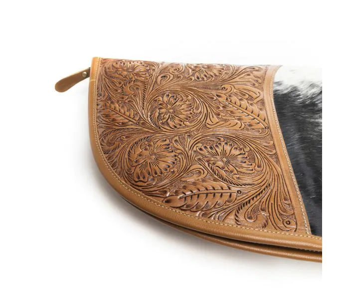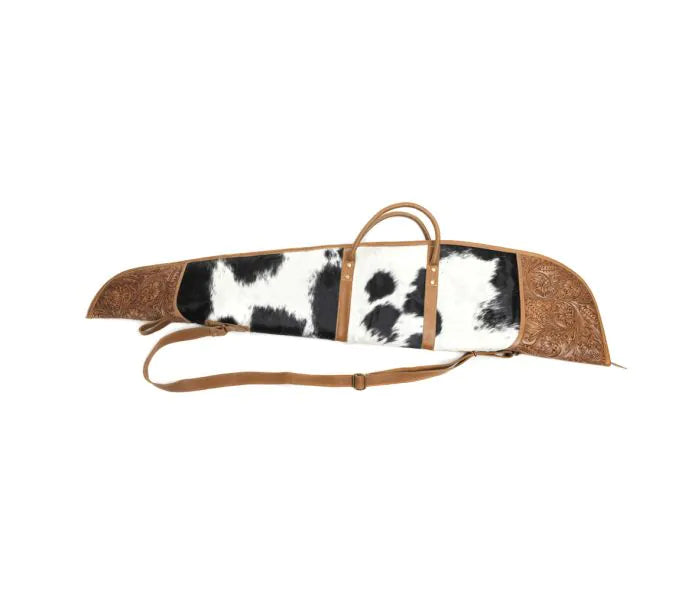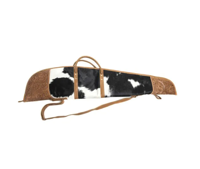 Precision craftsmanship and style this make this rifle case a standout. It will protect and carry your rifle or long gun securely. Black and white hair-on hide is accented with a beautiful panel of hand-tooled leather; the whole case is accented and trimmed in caramel brown leather, stitched to perfection. Wrap-around zipper. The detachable, adjustable shoulder strap and carrying handles are in matching leather. A magnificent case in all regards.